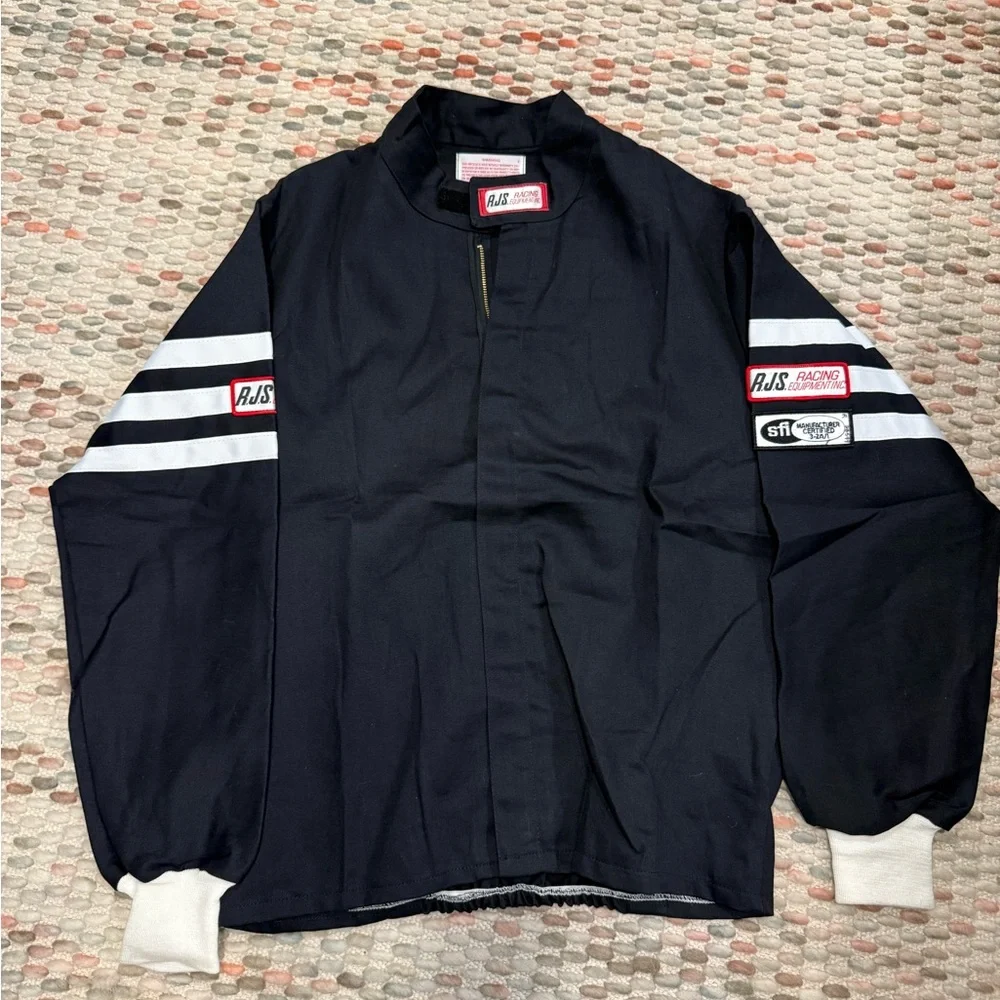 Lightweight black racing jacket with white sleeve stripes and cuff detailing. Vintage since I bought it in 1997. Never worn. Just cleaning out my closet.