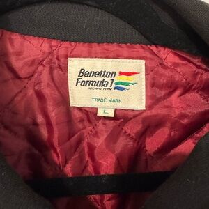 Classic bomber jacket with bold red accents. Features embroidered patches for a sporty look. Comfortable and stylish. Fits like a medium