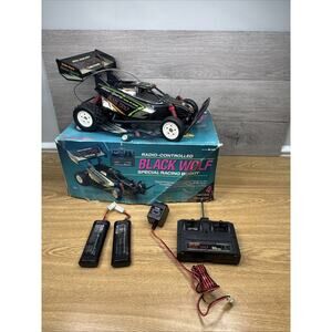 Classic vintage Radio Shack Black Wolf Special Racing Buggy (Model 60-4101) in tested working condition. Comes with the original box, remote controller, two battery packs, and charger. This off-road R/C buggy is a true 1980s/1990s classic — fast, durable, and fun to drive or display.