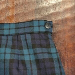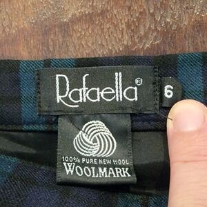 Evoke timeless elegance with this vintage Rafaella plaid skirt, a sophisticated statement piece that blends classic style with modern flair. The rich black and green plaid pattern offers a touch of heritage charm, while the fringe hem adds a playful, contemporary edge. Fully lined for comfort and a smooth silhouette, this skirt is perfect for creating a polished, professional look. Imagine yourself commanding attention at your next business meeting or exuding confidence at a formal dinner. This skirt is also ideal for adding a touch of refined style to a special event.