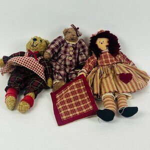 Vintage Rag Doll & Teddy Bear Collectors Set Plaid Outfits Rustic style Soft Rag