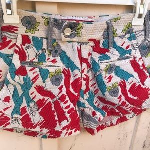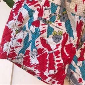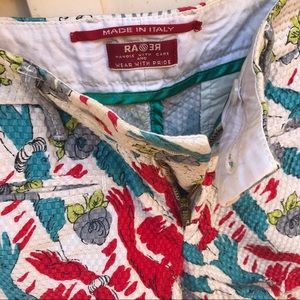 Super rare! A unique pattern of vintage imagery. These have a quilted feeling to them - a raised checkered texture. 2 front button closures one in front + one inside, zipper closure, 2 front slit pockets, 2 side pockets, + 2 back buttoned pockets. Has a few yellowish spots from being a vintage piece but no other flaws. Made in Italy. 100% Cotton