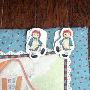 This Vintage Raggedy Ann & Andy Express Wagon Comforter Baby Crib Blanket is a handmade quilt featuring the beloved Raggedy Ann & Andy characters. The multicolor front with a mostly blue back adds a playful and charming touch to the nursery. Made of cotton, this unisex crib blanket measures 31 inches in width and 42 inches in length, making it the perfect size to fit a baby crib. Easy to care for and embroidered with attention to detail, this raggedy Raggedy Ann & Andy blanket is a cozy and charming addition to any little one's nursery.