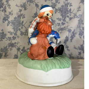 Charming musical figurine featuring Raggedy Ann and Andy. Raggedy Andy is helping Raggedy Ann up off the ground with Raggedy Dog.