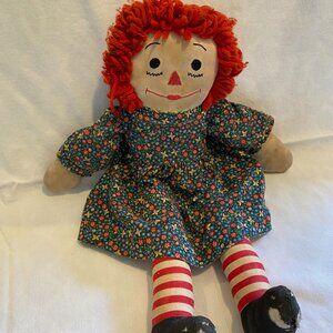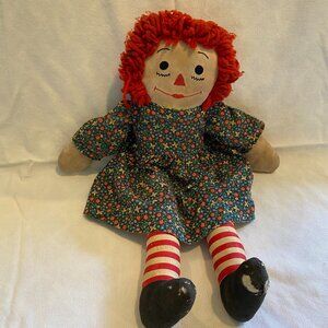 This charming 20-inch Vintage Raggedy Ann Doll features a hand-embroidered face and "I Love You" heart, making it a true classic. Dressed in a floral dress with red yarn hair and signature striped socks, this beloved doll is a must-have for collectors or nostalgic gifts.
