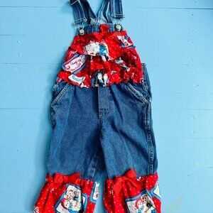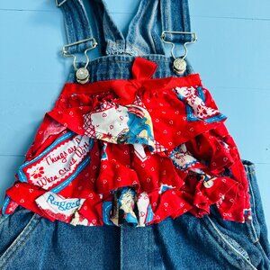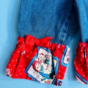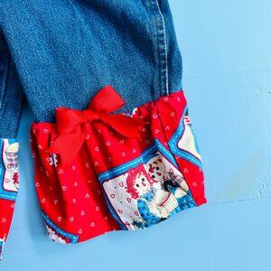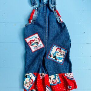 Adorable vintage denim overalls - embellished with Raggedy Ann and Andy details! They have ruffled hems, a three-tiered ruffled bodice and two patches on the backside. They also have big red bows on the legs and center of the bodice. Toddler size 2T. In good vintage condition. They measure 27" long.