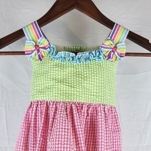 Vintage Emily Rose rainbow gingham fish dress. Tiered skirt. Bow detail on straps. Back button closure. Tie belt. Ruffle hem. Great condition. Size 5.