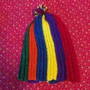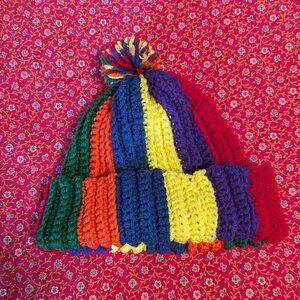 Vintage Rainbow Hat Knit Beanie Cap Pom Clown Umbrella Pattern Unisex