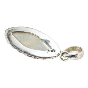 Handcrafted sterling silver pendant featuring a natural rainbow moonstone with blue and multi-color adularescence. The marquise-cut cabochon is bezel set within a twisted rope frame and marked SJ 925 (sterling).