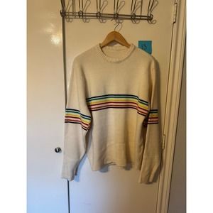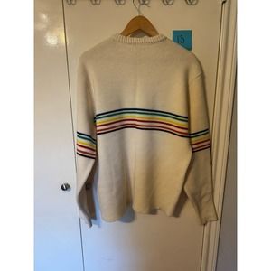 This true vintage rainbow sweater is a rare find indeed! There is a barely noticeable spot on one arm (pictured) but in otherwise excellent condition. There is no tag, but I'd say this is a size L/XL. Pit to pit and length measurements are pictured.