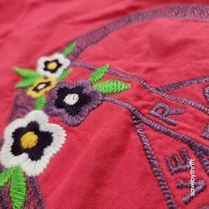 The shirt is a solid pattern and has accents that make it unique, such as the embroidered peace character. This t-shirt is perfect for women who love vintage clothing and want to add a touch of nostalgia to their wardrobe. It is a great gift for anyone who loves Disney or vintage clothing.