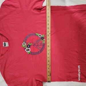 This vintage Rain Forest Cafe t-shirt is a must-have for any Disney fan. The shirt features a beautiful peace floral design that is embroidered on the pink fabric. The shirt is a size XL and has a regular fit, with short sleeves that make it perfect for any casual occasion. The t-shirt is made of high-quality materials, ensuring that it will last for years to come.