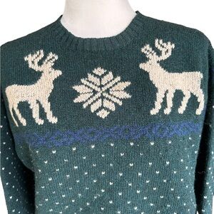 Vintage Ralph Lauren 100% Wool Hand Knit Winter Preppy Sweater A very rare color scheme, this green base, 100% wool hand knit sweater features cream colored deer and large snowflakes with blue line accents on the chest and wrist. Polka dots miniature snowflakes adorn the chest to the bottom of the sweater. Images are mirrored on both front and back.