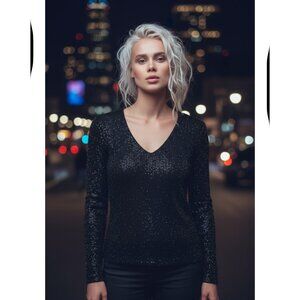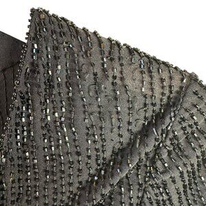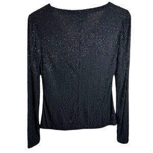 Elegant vintage top in black covered in sparkly black bugle beads. V-neckline and long sleeves