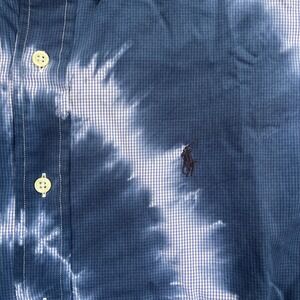 Stand out in this unique Ralph Lauren Blake button-down shirt featuring a custom navy and white spiral tie-dye over a subtle gingham base. Made from 100% two-ply cotton, this size M shirt offers classic Ralph Lauren quality with a bold modern twist. Button-down collar, long sleeves, and signature embroidered pony logo on chest. Great for casual wear or collectors of vintage Ralph Lauren.