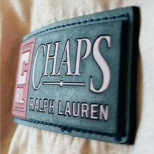 Stylish Ralph Lauren Chaps windbreaker. Red white blue color scheme. Features logo accents.