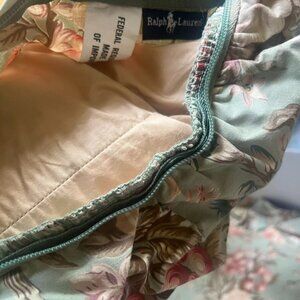 This pair of Ralph Lauren Charlotte throw pillows features a vintage floral design with a cottage-core aesthetic. The soft pastel tones and ruffled edges add an elegant and timeless charm to any room.