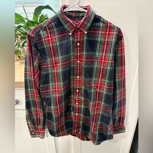 This classic vintage Ralph Lauren plaid button-up shirt is a must-have for any fashion-forward man's wardrobe. The shirt features a green and red plaid pattern, long sleeves, and a collared neckline that gives it a timeless, preppy look. The shirt is made of 100% cotton woven fabric that makes it comfortable for all seasons.