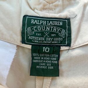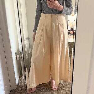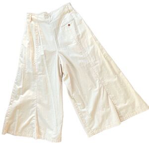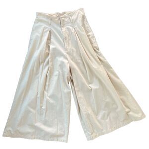 Vintage Ralph Lauren Country 80s era wide leg pants. Flare put palazzo pants in a cream light yellow color. Belt loops and high waisted. Cotton. In good shape with one mark on pant leg. Pleated front.