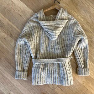 Oatmeal in color. Hooded with funtional pocket and belt.