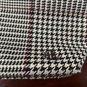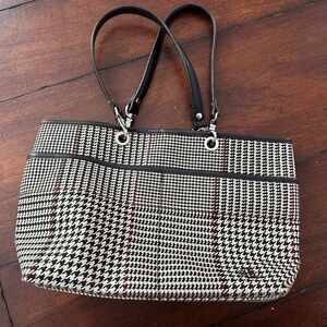 This vintage bag is a brown houndstooth plaid (brown, tan and maroons) with deep brown handles. It has two leather ties for closure. Has an inside zipper pocket. Measures 8" high and 12" wide. Cute fall mini bucket-like bag for running here and there. There are also two open pockets in the front. Still lots of love left.