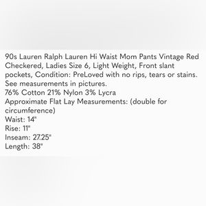 Vintage Ralph Lauren Hi Waist Light Weight Red Checkered Plaid Pattern Size 6