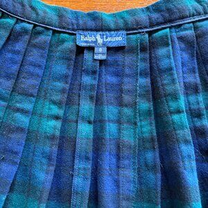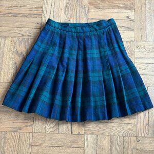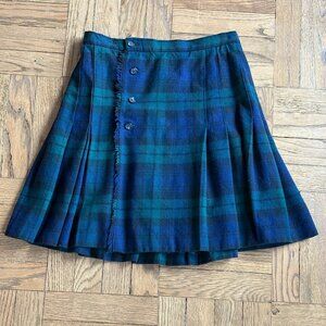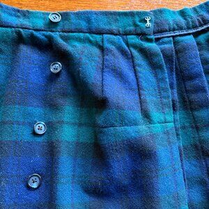 Blue and green plaid wool wrap skirt with hook and button closure. Small hole near the third button (see last photo).
