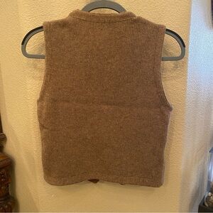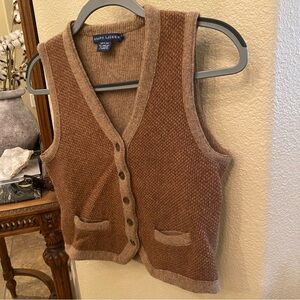 Pre-owned in great condition with no stains but has a tiny hole on the front left chest area as shown in picture. Not too noticeable. Elegant vintage light brown lambswool, cashmere and merino wool buttoned vest by Ralph Lauren. Features button closure and two front pockets. Dry clean only. Might fit a little small. Please check measurements. Comes from smoke and pet free home.