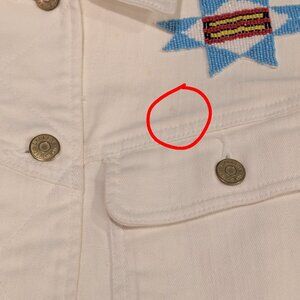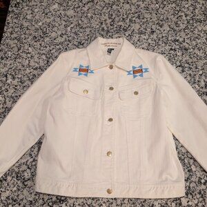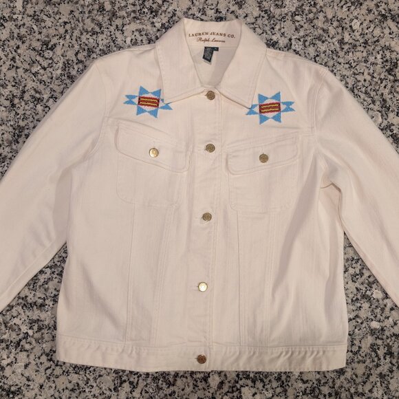 Vintage denim beaded jacket by Ralph Lauren. The jacket has been beautifully beaded in a Native American style. It is in beautiful vintage condition. There are some minor stains and very very faint red marks possibly caused by someone wearing a new red shirt underneath of it. Please see additional photos. This same style of jacket is on eBay for over $200. The jacket comes from a smoke/ bug/ cat free home.