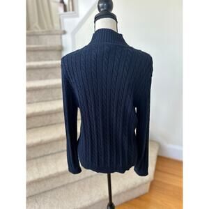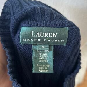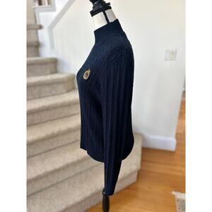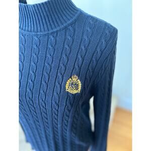 Excellent condition. Dark navy, cable knit, long sleeve turtleneck. Gold crest anchor logo with Ralph Lauren text on chest.