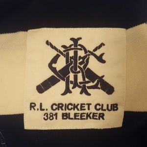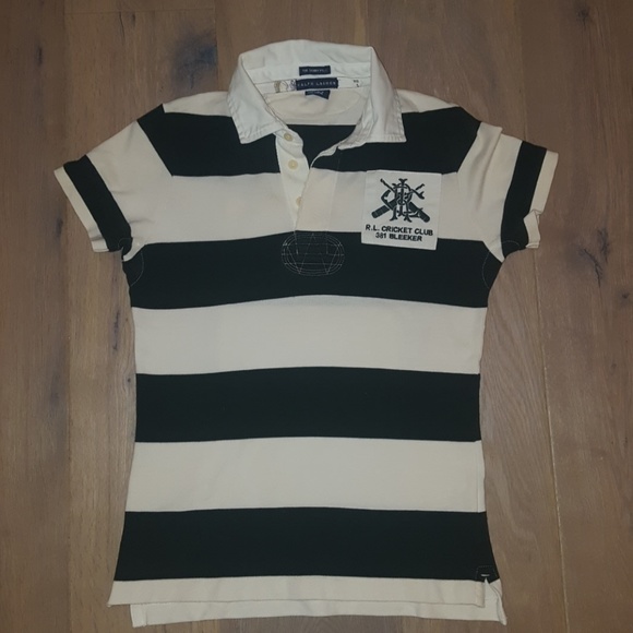 Dark green and white striped vintage looking Ralph Lauren Rugby short sleeve polo. Cool cricket club Bleaker patch on chest and 21 centenary cup on back.