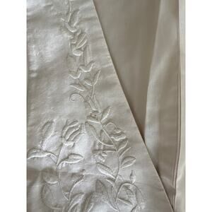 Vintage Ralph Lauren silk embroidered vest in soft ivory with tonal floral stitching and adjustable back tab. Tailored fit with full lining and classic button front. A rare heritage-style piece perfect for fall layering, vintage suiting, or holiday looks. The subtle sheen and delicate embroidery evoke equestrian and heritage influences seen in current preppy and academia trends. Small faint mark on the front—may lift with gentle cleaning. Pairs beautifully with velvet skirts, trousers, or over crisp blouses.