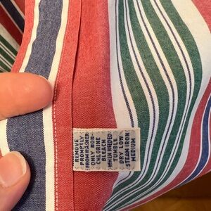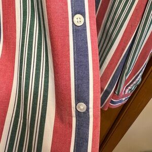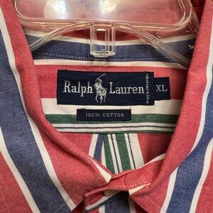 Ralph Lauren men’s 100% cotton long-sleeved red, blue, white, and green striped button down collared shirt with button down collar, size XL.