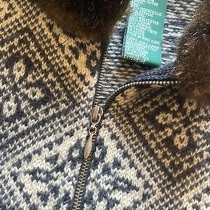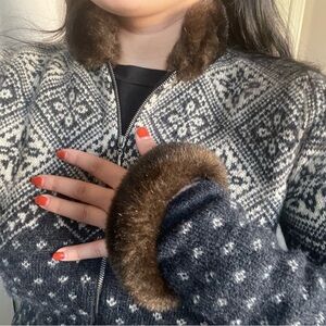 In a blue/cream color // features faux fur collar and sleeve trim, such a cute piece for the winter // in great condition, gently used // marked a small, will fit a medium due to stretch // im a 28/29 for reference and im 5’3”