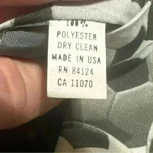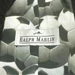 Elevate your soccer-themed outfit with this vintage Ralph Marlin neck tie. The black, white, and gray design features soccer balls as the main pattern, making it perfect for any soccer fan or coach. Made of 100% polyester, this tie is durable and easy to maintain.