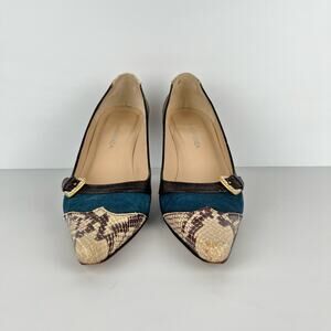 Vintage Ramon Tenza leather and snake skin heels. Stacked wooden heel is 3ins and buckle has rhinestone detailing. Made in Spain. Gently worn in great vintage pre-owned condition!