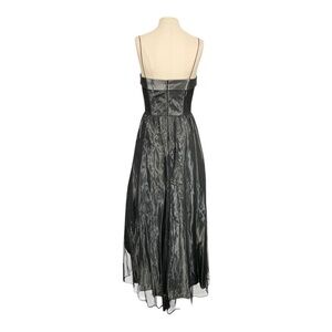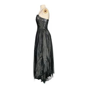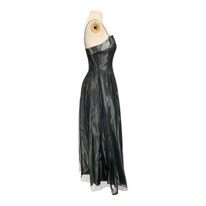 Features: This is an authentic y2k/90s prom evening formal gown. Taffeta style silver fabric with black micro mesh overlay. Square neckline. Sleeveless. Fitted bodice. Flowy maxi length skirt. Zip closure.