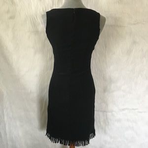 vintage rampage faux suede black mini dress. features a v neck, darting on the bust, and a fringe bottom. the 90s are back in style! the fit is a mix between a bodycon & a sheath.