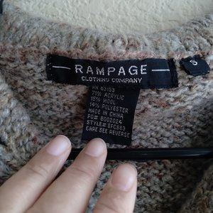 Vintage Rampage clothing long sleeve knit cardigan with buttons and a cable knit detail. The knit is multicolored with it being gray/grey and hints of light green and reddish brown scattered through out. Size small. Made of 71% acrylic, 15% wool, and 14% polyester. In good condition.