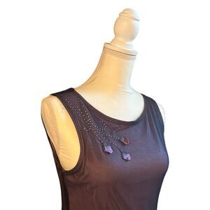 Vintage Rampage maxi length dress in color purple with black mesh overlay. Beaded floral theme design on the right shoulder. Made in USA, dry clean only. US size Medium, please verify your measurements below.