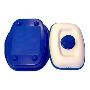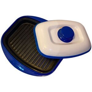 The Vintage Range Mate Microwave Grill is a blue and white rectangular covered dish that serves as a microwave cooker. Manufactured by Rangemate in Korea, Republic of, this gadget is designed for microwave cooking. Made from plastic and metal materials, it provides a convenient way to grill steaks and other dishes in the microwave. Its vintage style adds a touch of nostalgia to the kitchen, making it a unique and practical addition for those looking to enhance their microwave cooking experience.