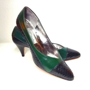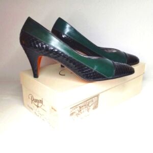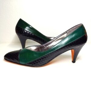 Vintage Rangoni of Florence Italian Heels Dark Green Tuscan Calf Black Snake Leather 7.5 AAA Neiman Marcus