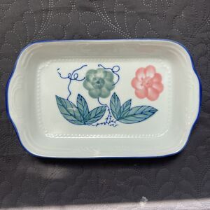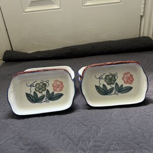 Vintage Rare 6pc Ceramic Flower Rectangular Bowl in Wicker Basket Hand Painted
