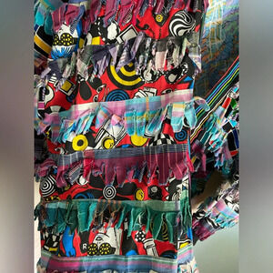 Each panel is a different fabric with appliqué strips of other fabrics. Edging in stripes with logo clear buttons.