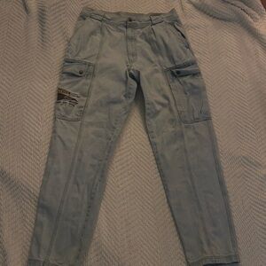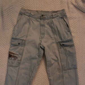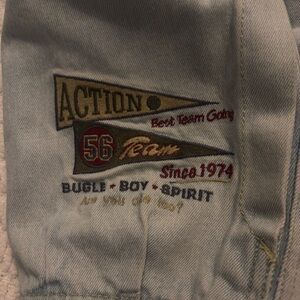 Light blue pants with detailed embroidery. Features unique Bugle Boy branding.