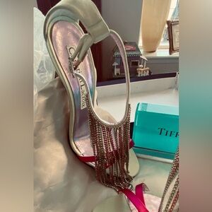 There are not enough words to describe how beautiful these shoes are. The foot is made of silk, and the ankle strap drapes with a waterfall of pink and green rhinestones. The heels are red carpet ready to wear they have never been worn. The body is light green and fuchsia pink