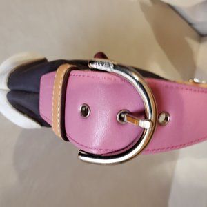 in colors of black , with tan, purple, and white colored genuine leather with silver colored hardware .This edition piece