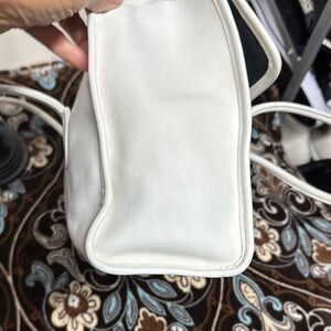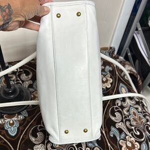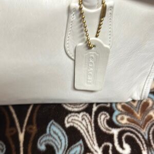 This Coach shoulder bag in a pristine white hue is crafted from textured leather, featuring a subtle crocodile pattern. Its structured, boxy design with a flap closure and dual handles offers a sophisticated and versatile look, perfect for everyday elegance. The same bag selling for over 800. This bag is a timeless beauty. See all photos as they are part of description.