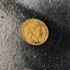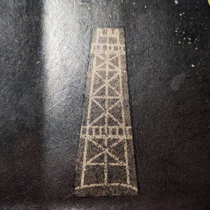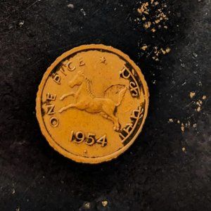 This tray is Mid-century circa 1950's and measures approx. 6" x 7". There are 3 embedded coins, and inlaid oil derrick, and gold flecks. The topmost brass coin reads "Republica Peruana", dated 1953 (worth $20-30), the middle coin reads "Elizabeth II Del Gratia Regina" (worth $15-25), the bottom coin reads "One Pice" in English and Indian, dated 1954 (worth $5-10).