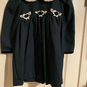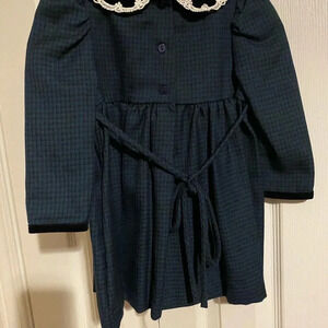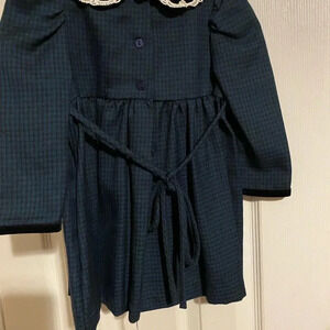 Green plaid with lace trimmed velvet collar and three ribbon flowers trimmed in lace